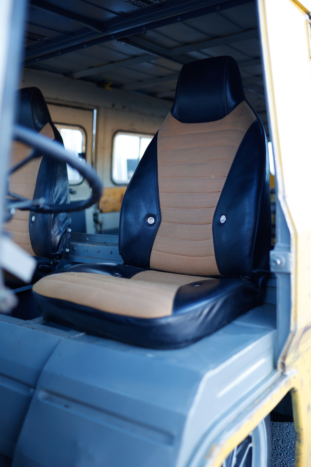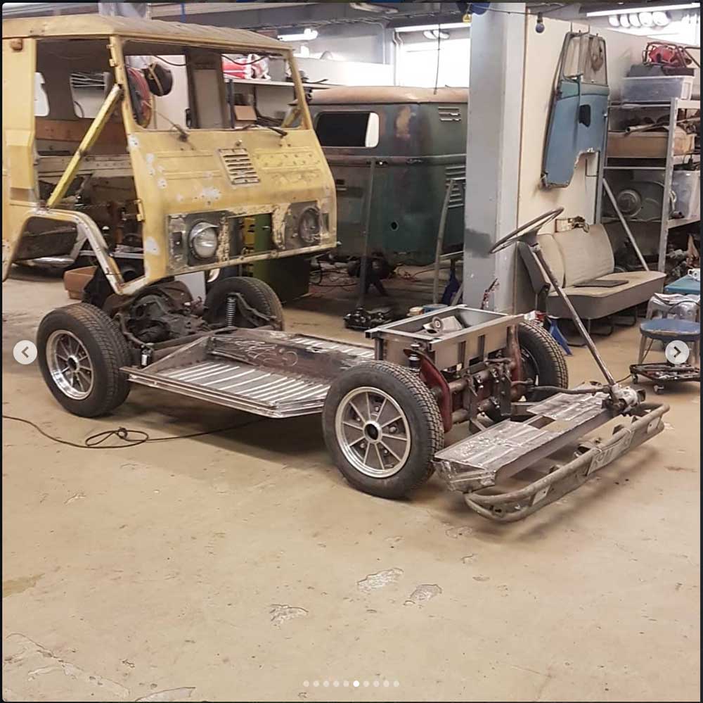 The fuel tank comes from a Type 3, and the front seats are taken from a Datsun 240Z. The rear seat comes from a VW T3 Double Cab.