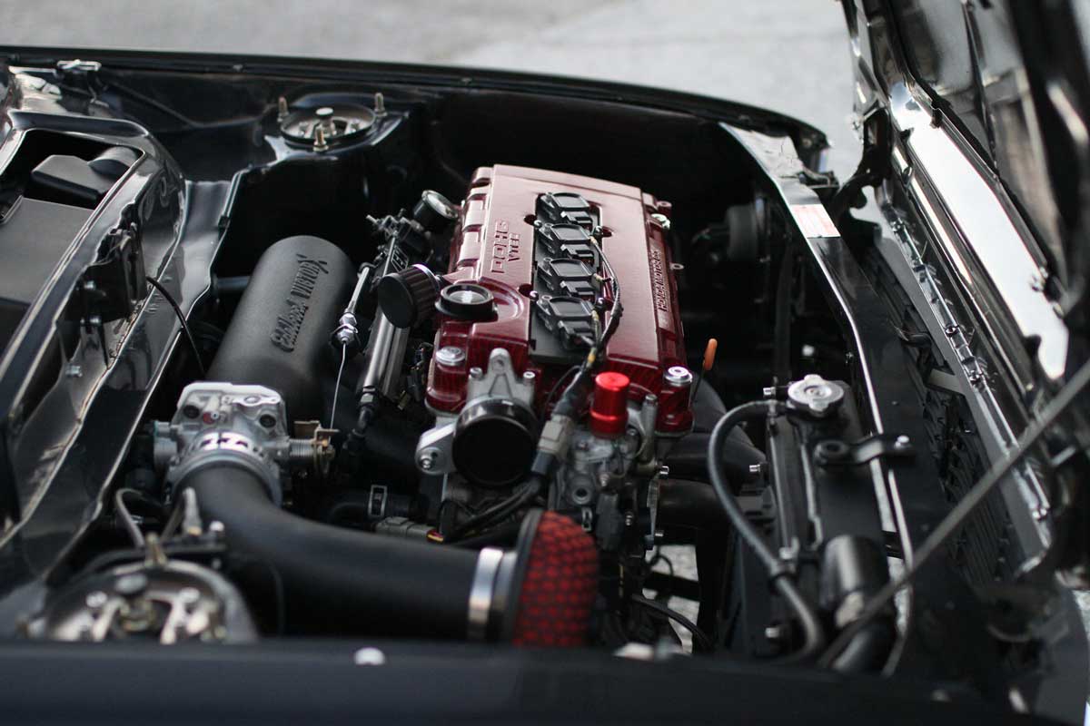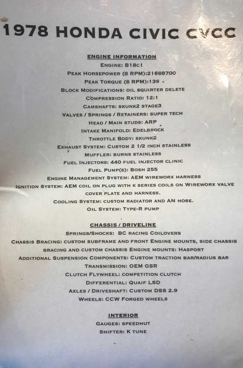 “The engine is a B18C from a 1998 Integra. A good friend welded a completely new radiator and 2 1/2 inch stainless exhaust system. The air intake is shortened, and the Bosh 255 fuel pump can handle up to 1,000 horsepower and the oil is pumped with a type-r pump.”