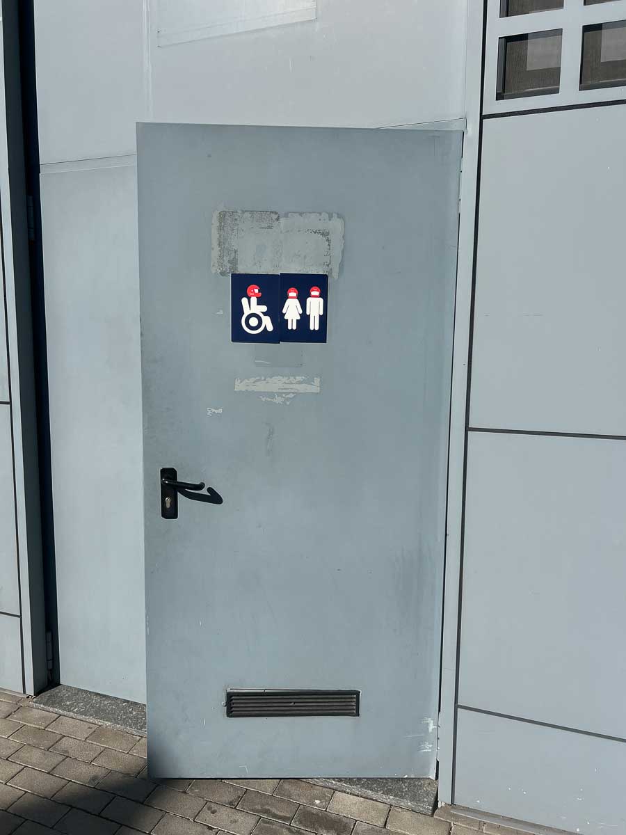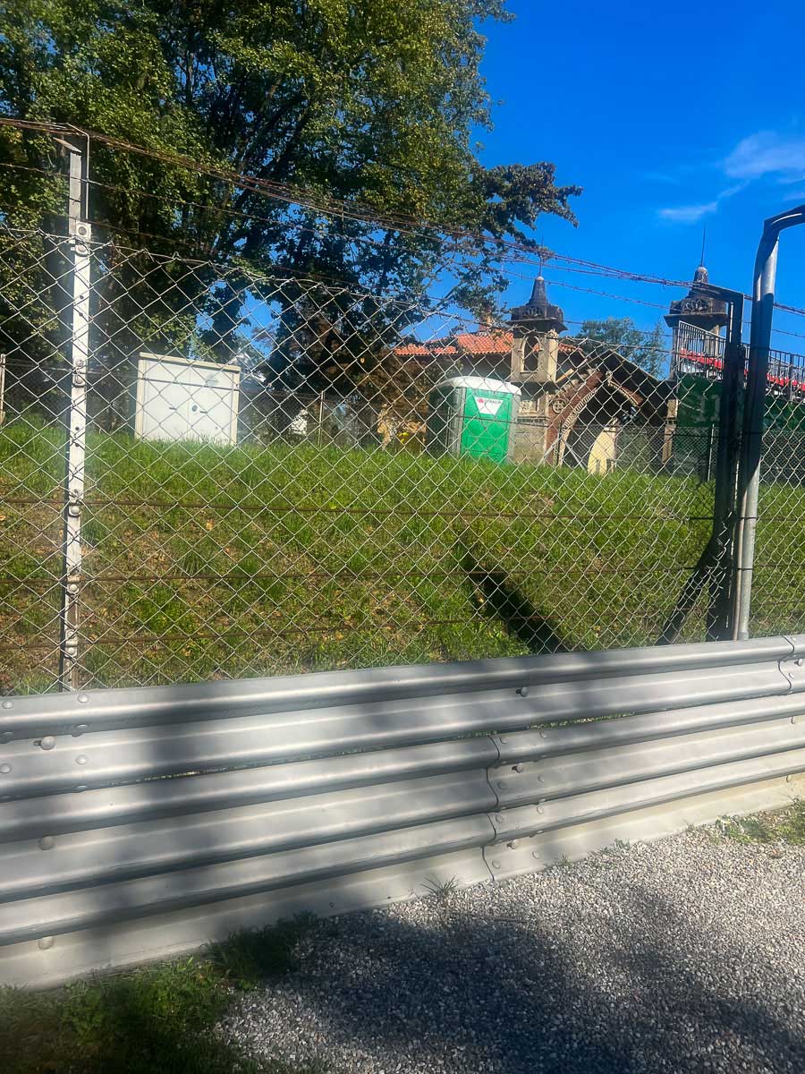 This building feels completely out of place where it stands, 30 meters from the track’s fence with a green, almost glowing porta-potty beside it.