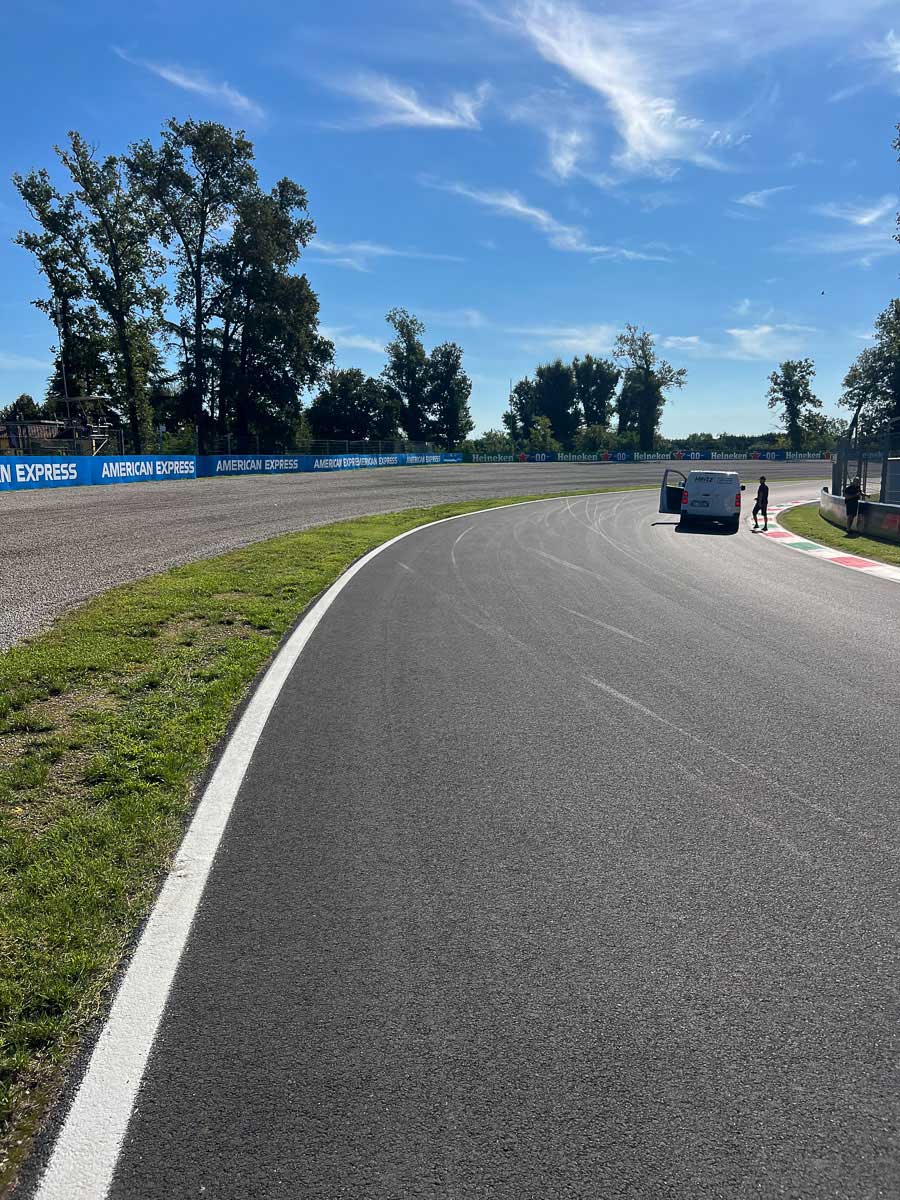 In the Ascari chicane, three men are painting advertisements on the grass. One of them smiles at me and nods as I see a drop of sweat run down his forehead. I smile back and behind him the huge straight leading down to Parabolica takes shape. Almost one kilometer of asphalt lies in front of me down to the long right-hander.