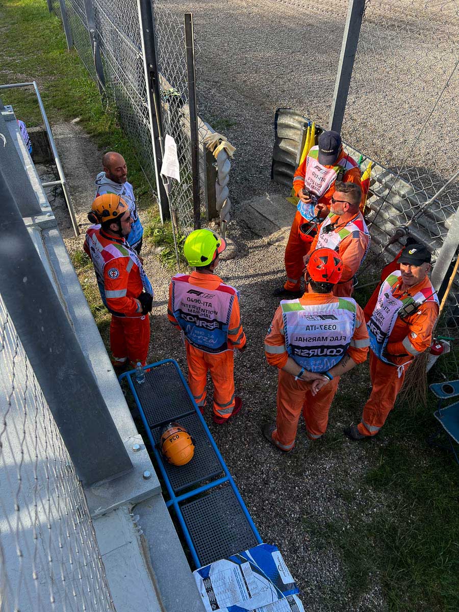 Along the way, many are working to finish preparing the track, and in Curva Grande, the longest corner at Monza where the drivers go full throttle, three men stand on a scaffold at the end of the gravel runoff, above the tire barrier. They are working on replacing one of the flag monitors but seem to be having some trouble, as one of them swears in Italian so loudly it echoes across the entire corner.