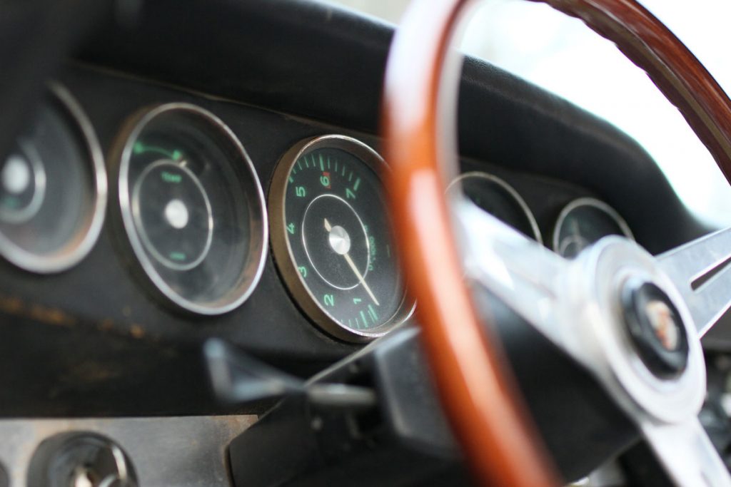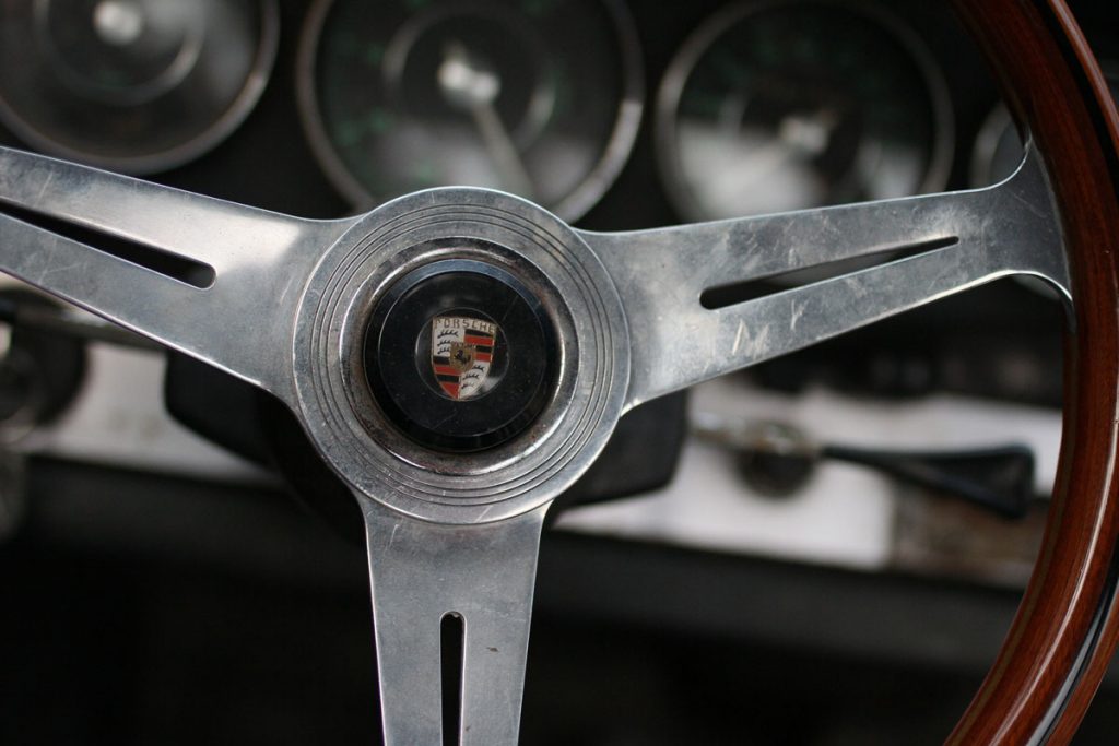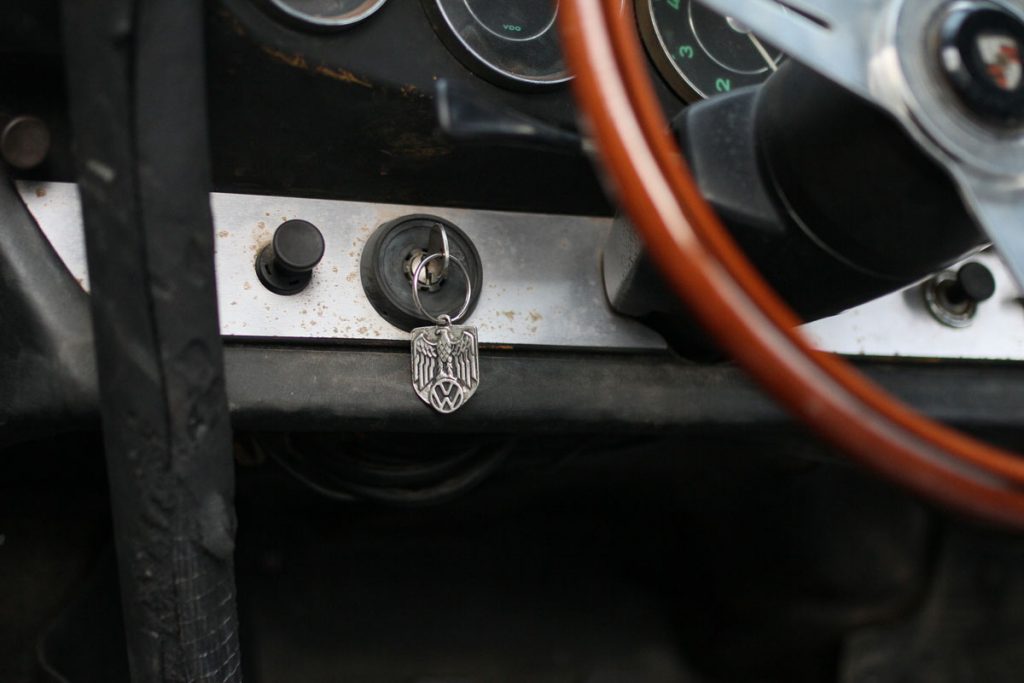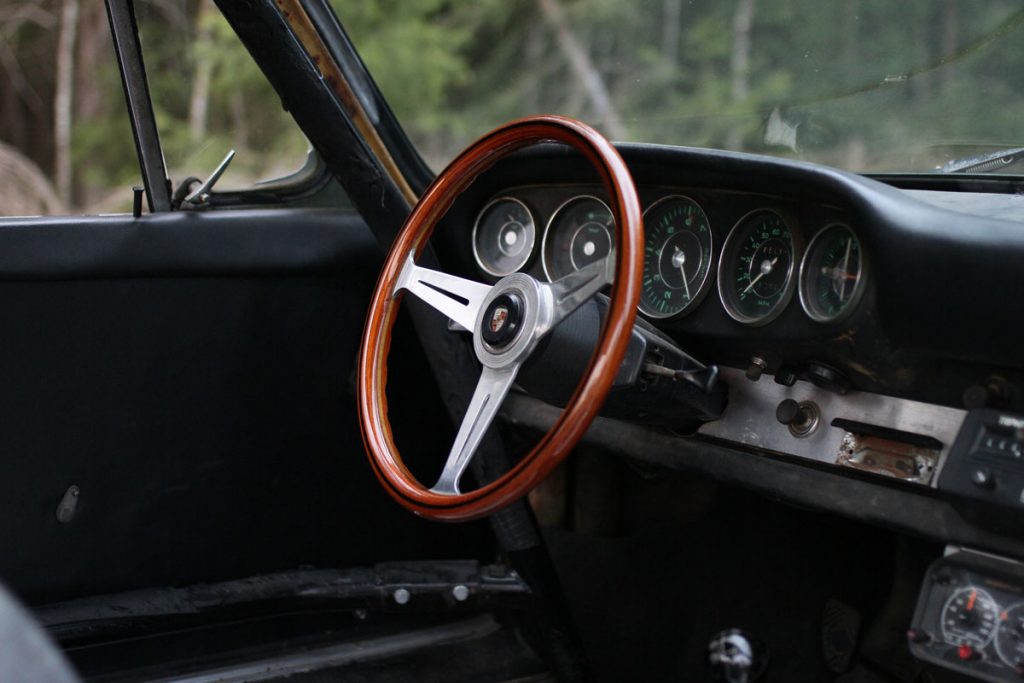 He replaced the Fuchs rims with the more racing-like Ronal Kleeblatt rims. The damp original chairs had to make room for a pair of Swedish hand-knocked 356 chairs in aluminum, purchased through Urban’s Garage. The Nardi steering wheel, which was part of a barter, fit directly into the stripped-down coupe. The original rearview mirror had to make room for Mr Talbot and the gear knob was bought at a flea market.