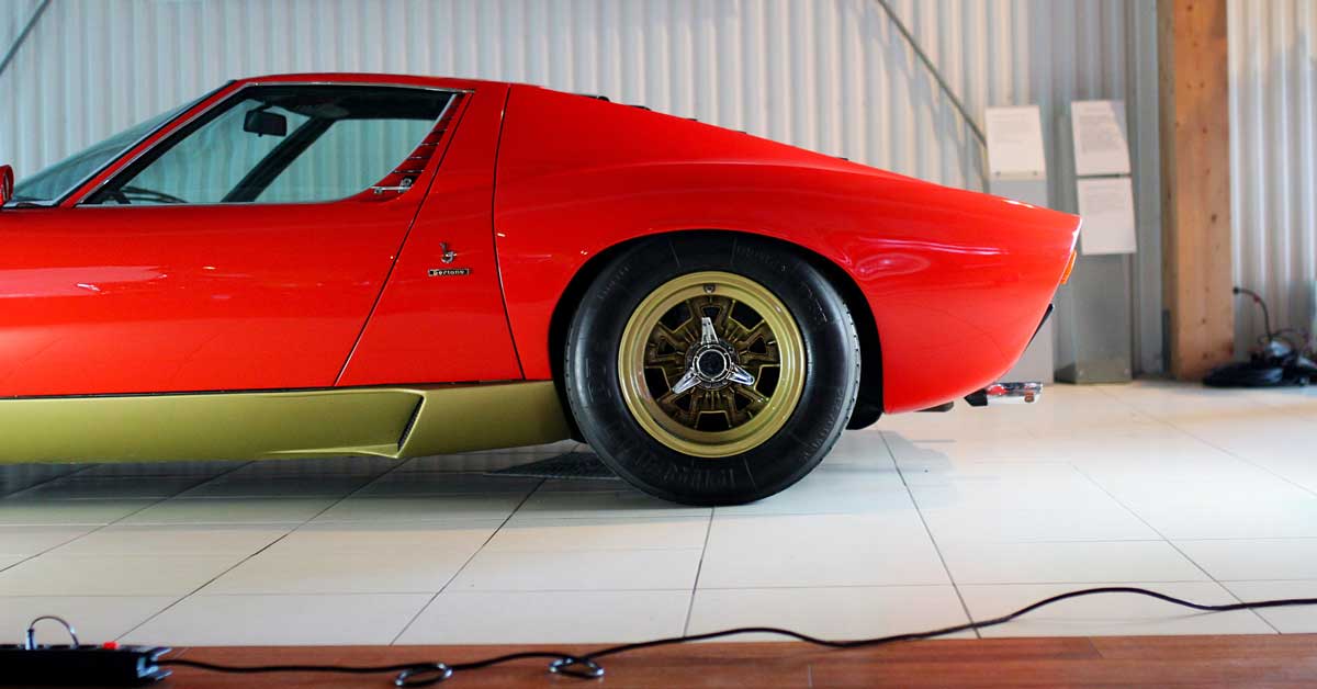 Just inside the door stands the orange Jarama, glowing like a freshly polished toy car. I can hardly take it in—it’s so beautiful, and it captures my attention every single time I see it. It grabs me so completely that I almost miss the red, silky, low-slung Miura with gold rims standing right in front of it. I can’t believe I nearly overlooked it. What a piece of art!
