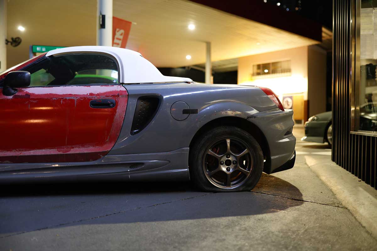 At pump number 3, which I later learn is 100% fake, stands an ice-blue Nissan Silvia Cab (S13), which immediately makes me smile, as Takumi’s friend Itsuki completely destroyed a similar one in the film when he tried to make his way down the winding roads of Mount Akina.