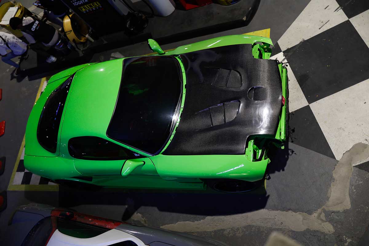 Outside stands a cyan Mazda RX-7 FD with its front taken apart and a beaten-up Toyota MR2 Spyder with an empty left rear tire.