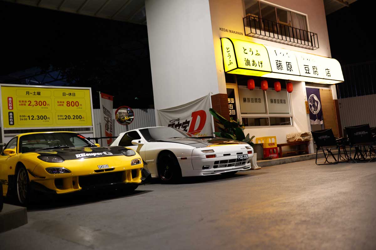 Behind the cars, there are more traces of Initial D, as the classic yellow-and-white, rock-solid plastic awning stretches along the wall. It is the facade of the Tofu master’s shop in the film, where it says Fujiwara Tofu Shop.